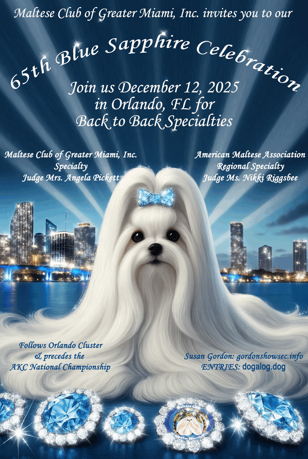 If you are as dedicated, to the Maltese breed, as we are, or just beginning your Maltese journey, we invite you to our yearly Specialty Shows in December. We would love to meet you, and welcome you, to become a new member of our club.